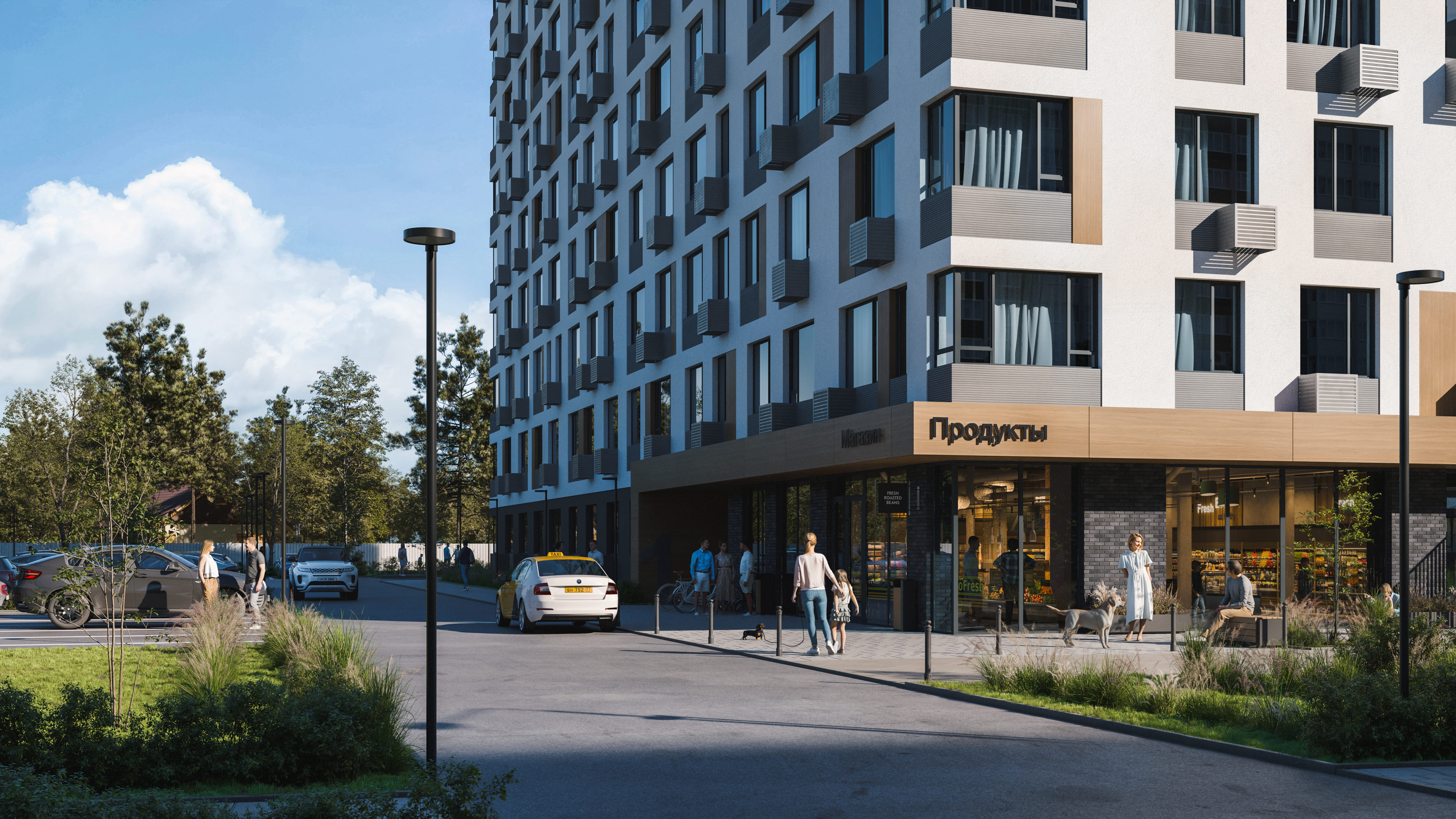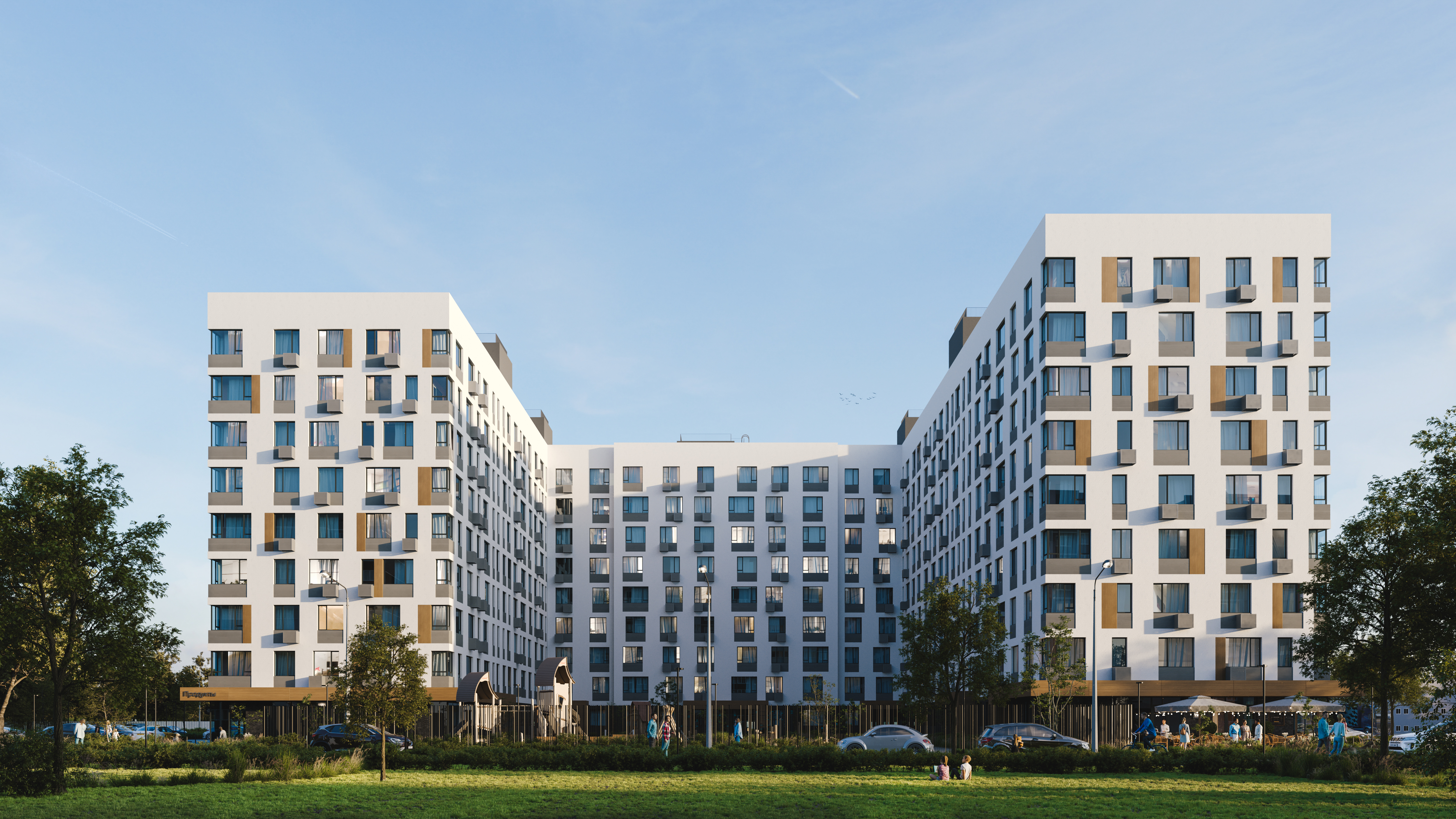 - На первом этаже — коммерческие помещения, закрывающие базовые потребности жителей комплекса.